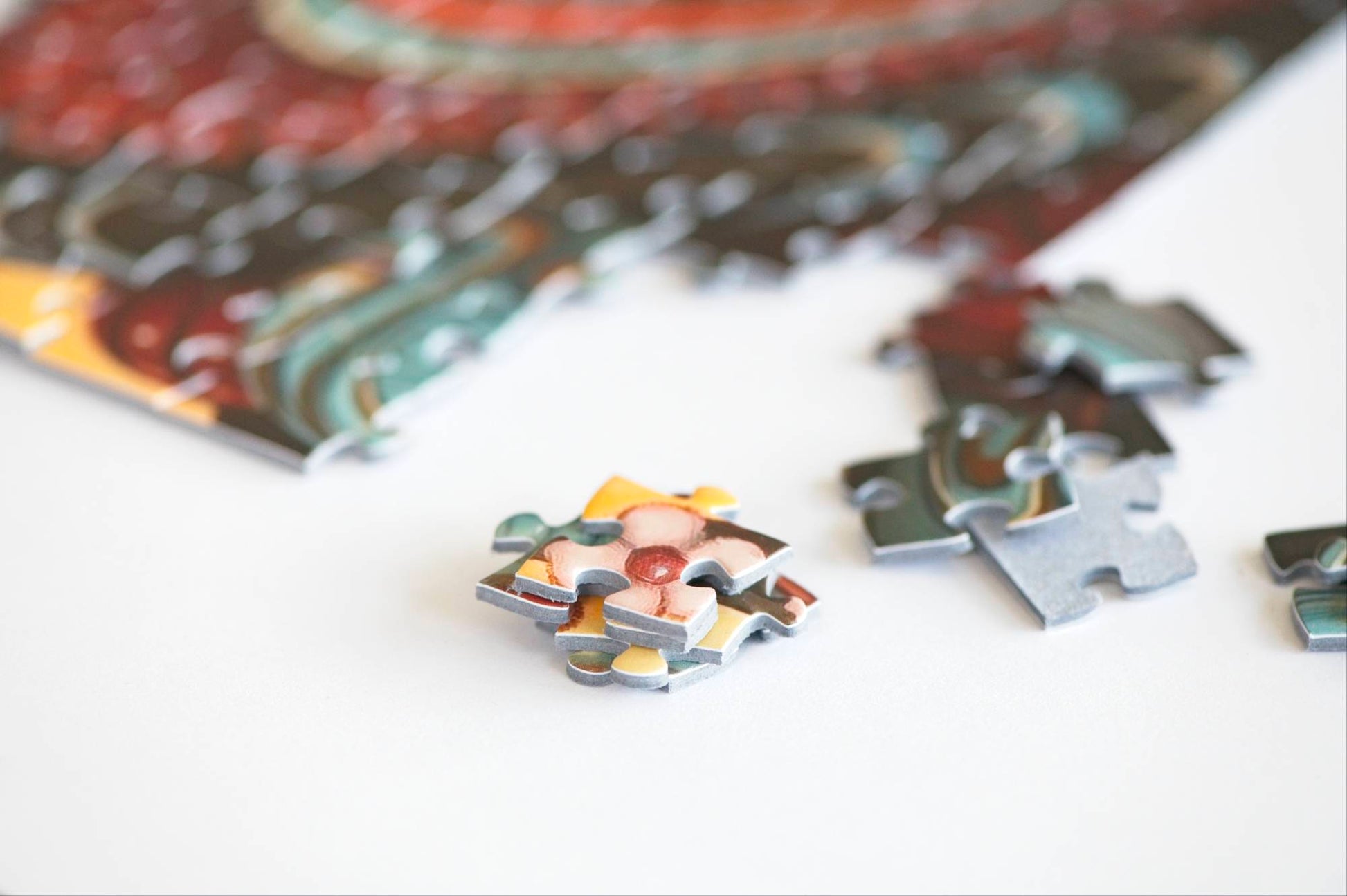 - Puzzle pieces are packed in a reusable, resealable bag
